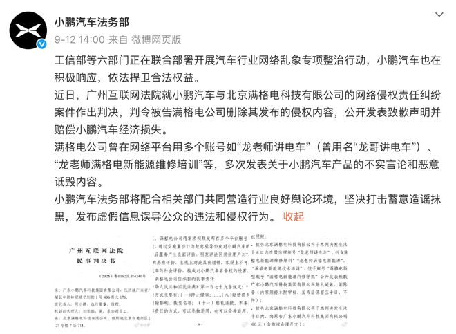 小鹏法务部发文称广州互联网法院就小鹏汽车与北京满格电科技有限公司的网络侵权责任纠纷案件作出判决,判令被告满格电公司删除其发布的侵权内容,公开发表致歉声明并赔偿小鹏汽车经济损失。