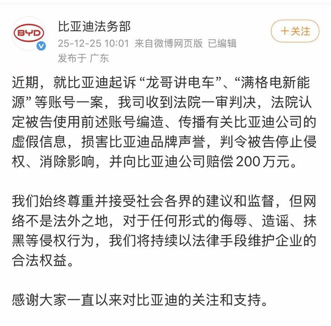 今日比亚迪法务部发文称,近期,就比亚迪起诉“龙哥讲电车”、“满格电新能源”等账号一案,该公司收到法院一审判决,法院认定被告使用前述账号编造、传播有关比亚迪公司的虚假信息,损害比亚迪商业信誉及商品声誉,判令被告停止侵权、消除影响,并向比亚迪公司赔偿 200 万元。
