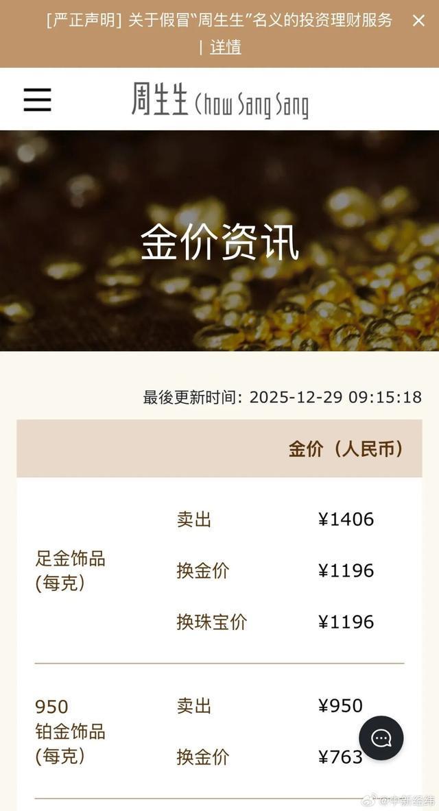 国内品牌金饰价格同步走低,记者查询到,周生生足金饰品报价1406元/克,较27日1412元/克跌6元/克。