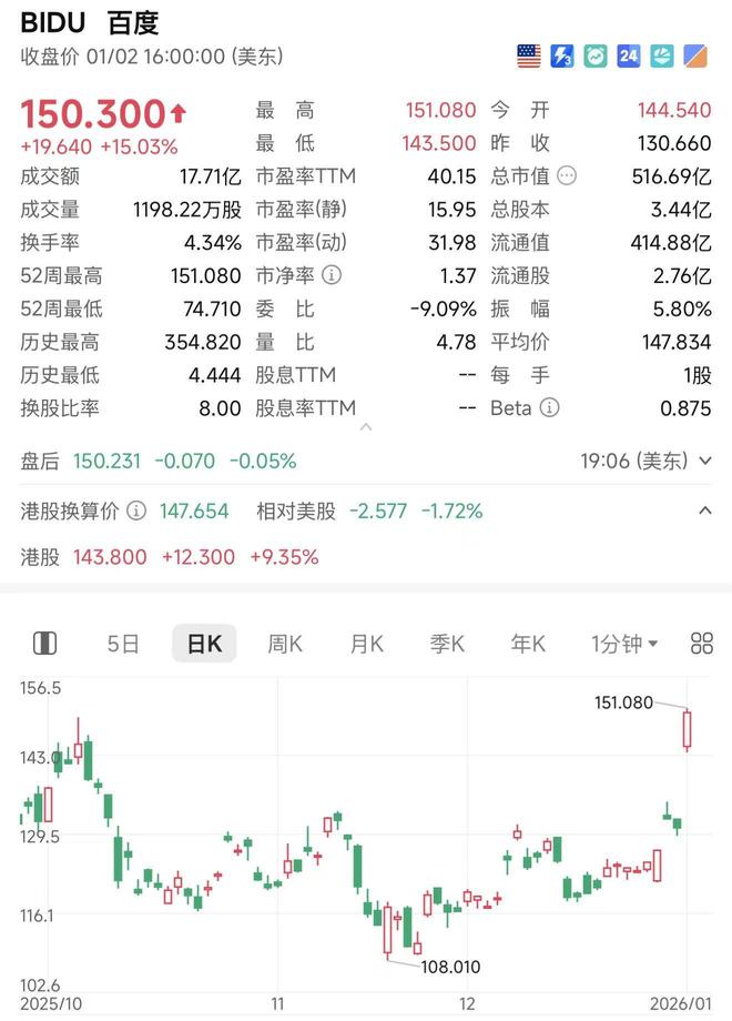 1月3日,百度美股大涨15%,市值重回500亿美元。