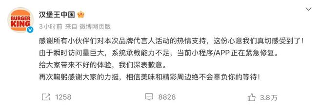 11时12分,汉堡王中国发文致歉:“感谢所有小伙伴们对本次品牌代言人活动的热情支持,这份心意我们真切感受到了!由于瞬时访问量巨大,系统承载能力不足,当前小程序/APP正在紧急修复。给大家带来不好的体验,我们深表歉意。”