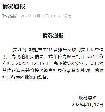 关注到“娜姐重生”抖音账号反映的关于我单位职工高飞的相关信息,我单位高度重视并成立工作专班。2025年12月5日,高飞被党纪处分。现已对其停职调查并将按照调查结果依规依纪处理。感谢社会各界的批评和监督。