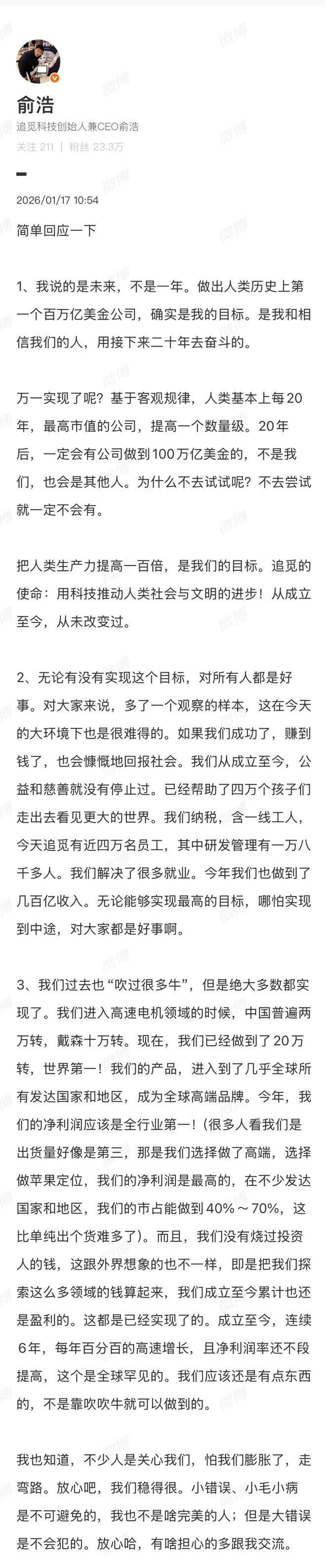 1月17日,追觅CEO发文回应近期质疑。