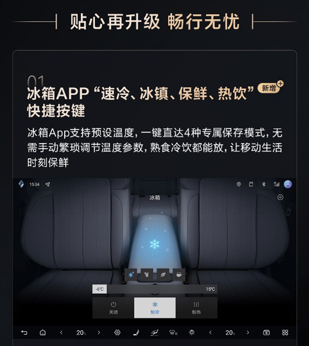 在用车方面,此次的OTA也是给出一个更便捷的用车场景,就是在冰箱APP中安排了“速冷、冰镇、保鲜、热饮”四大快捷键,这样无需做更复杂的调整,一键即可进入专属模式。