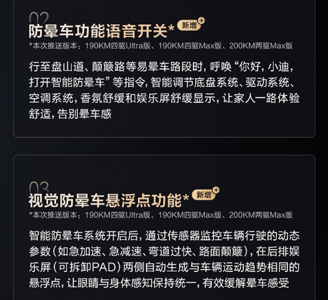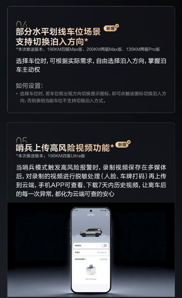 驾乘体验方面,本次OTA新增了语音控制智能防晕车功能。当行驶至盘山道、颠簸路段时,只需一句“你好,小迪,打开智能防晕车”,系统便可智能调节底盘、驱动与空调系统,并协同香氛与娱乐屏舒缓显示,让家人告别晕车感。而就泊车体验方面,新车也是增加了泊入方向的切换功能,可根据实际需求自主选择车头朝向,让泊车过程更加人性化。此次,车载无人机的生态也全面升级,新增一键跟车功能,在设定范围内,无人机处于飞行中且未处于跟随模式时,点击“一键跟车”按钮,可实现无人机自动跟随本车。