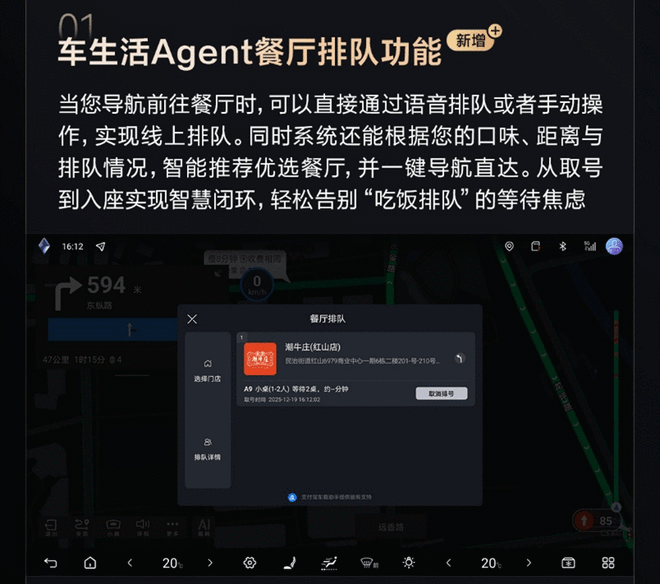 从此次OTA升级的信息来看,为营造全场景出行的体验,新车新增了车生活Agent餐厅排队功能,支持通过语音唤醒排队取号,集成餐厅推荐与一键导航到门店,通过智能化的控制降低“吃饭排队”的焦虑感。另外,新车在娱乐方面还新增网易云音乐并同步海量曲库。而手车互联新增荣耀车联与三星手机镜像模式,支持导航、应用无缝流转,营造多设备协同的智能生态。