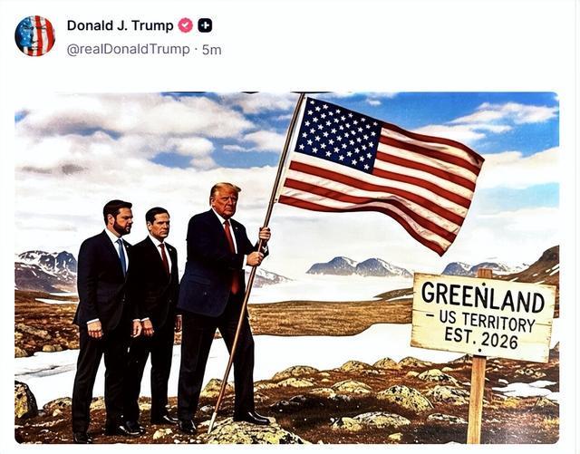 特朗普发布登上格陵兰岛的图片,手持美国国旗,旁边指示牌上写着“格陵兰岛将成为美国领土”,这一举动引发了争议和关注,人们对其背后的意图和可行性产生了质疑,这一事件也引发了关于领土争端和国际关系的讨论。