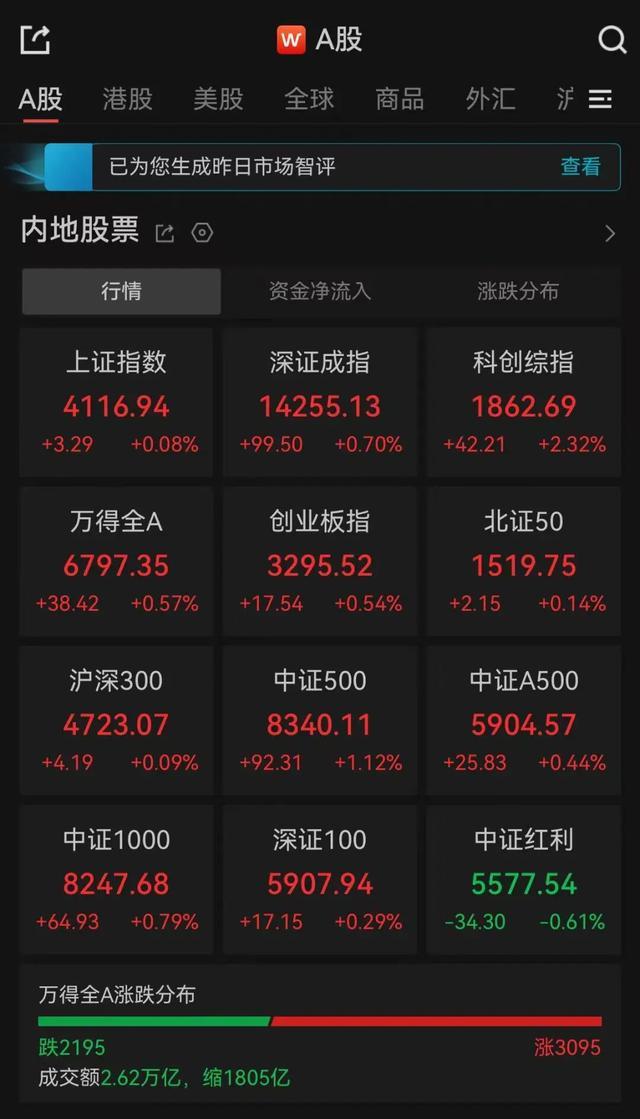 全市成交额2.62万亿,近3100只个股上涨。