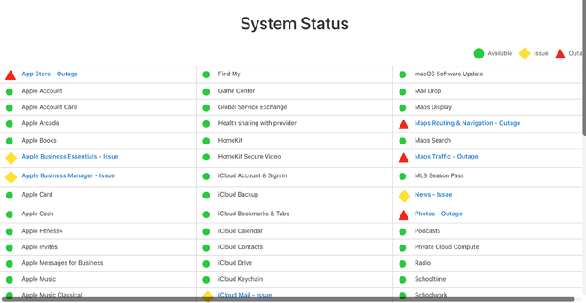 1月21日,苹果系统状态页面更新显示,由于持续性故障,部分用户可能正遭遇包括App Store、Apple TV和iTunes商店在内的多项苹果服务中断。该公司同时报告称,照片应用也受到影响,iMessage和iCloud版iWork也存在相关问题。