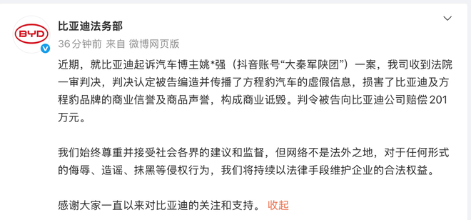 比亚迪法务部起诉博主大秦军陕团,编造方程豹汽车虚假信息,巨额赔偿达201万元