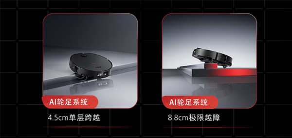 相较于行业主流2-4cm的越障能力,该系统可通过万向轮与左右驱动轮的协同抬升,实现最高8.8cm(4.5cm+4.3cm)的双层越障,无论是地垫、门槛还是小台阶等障碍区域,都能轻松应对。显著拓宽了扫拖机器人的可通行范围。更重要的是,这一能力并非依赖"蛮力",而建立在感知—判断—执行的完整逻辑之上。