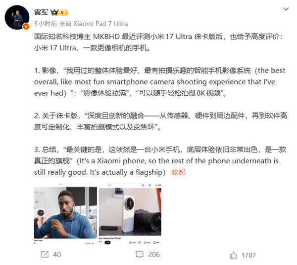 1月27日消息,今日,小米CEO雷军在微博发文,分享了国际知名科技博主MKBHD评测小米17 Ultra徕卡版给予的评价:小米17 Ultra,一款更像相机的手机。