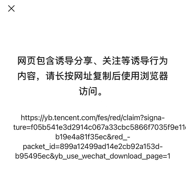 目前实测显示,在微信软件中已无法打开元宝红包分享链接,并提示:"网页包含诱导分享、关注等诱导行为内容",需要通过复制网址在浏览器中访问。