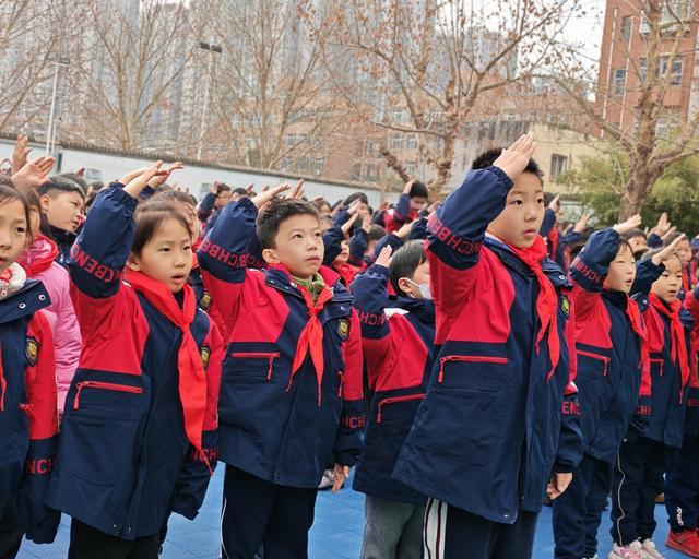 队旗猎猎,映照着一张张澄澈明亮的脸庞;国歌铿锵,激荡着一颗颗炽热滚烫的心房。典礼在庄严的升国旗、唱队歌仪式中拉开序幕,全体师生脱帽肃立,少先队员高举右臂行队礼,目光追随着冉冉升起的国旗,爱国的种子在春的气息里悄然扎根、静静生长。