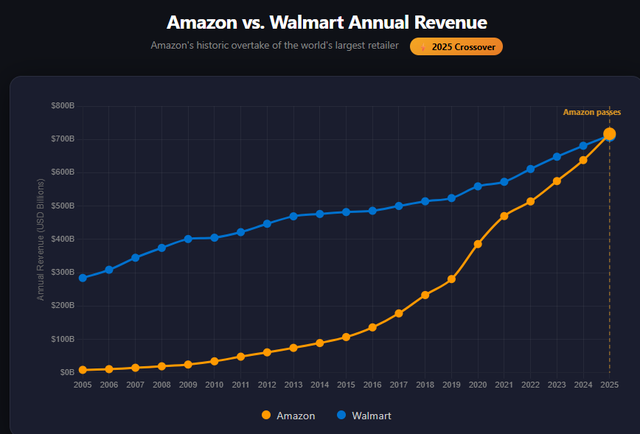 亚马逊(AMZN)公布2025财年营收为7169亿美元,略微超过沃尔玛截至2026年1月31日的12个月营收7132亿美元。