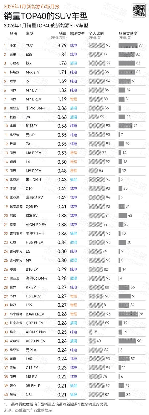 此外,1月新能源SUV销量第一是小米YU7,销量3.79万辆,其也是1月新能源全品类销量冠军;其次是蔚来ES8 1.84万辆;方程豹钛7销量1.76万辆;特斯拉Model Y(不包含Model Y L)销量1.71万辆;理想i6销量1.69万辆。