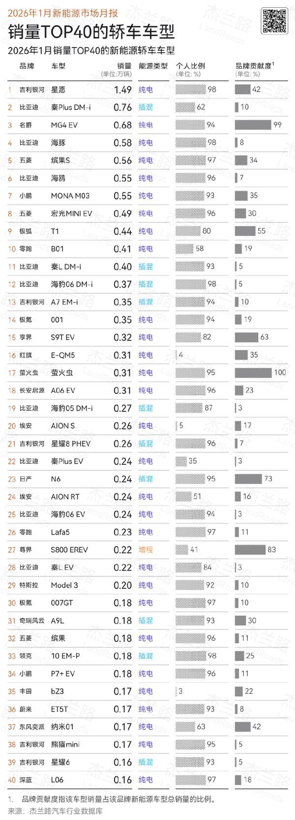 1月新能源轿车销量冠军依然是吉利银河星愿,销量1.49万辆;其次是比亚迪秦Plus DM-i 0.76万辆、MG4 EV 0.68万辆;比亚迪海豚 0.58万辆;五菱缤果S 0.56万辆。