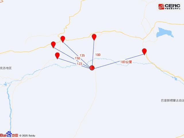 周边县城:震中距轮台县100公里、距沙雅县123公里、距库车市135公里、距新和县150公里、距尉犁县183公里,距铁门关市166公里,距乌鲁木齐市432公里。