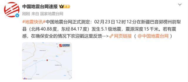 速报参数:据中国地震台网正式测定,2月23日12时12分在新疆巴音郭楞州尉犁县发生5.1级地震,震源深度15公里,震中位于北纬40.88度,东经84.17度。