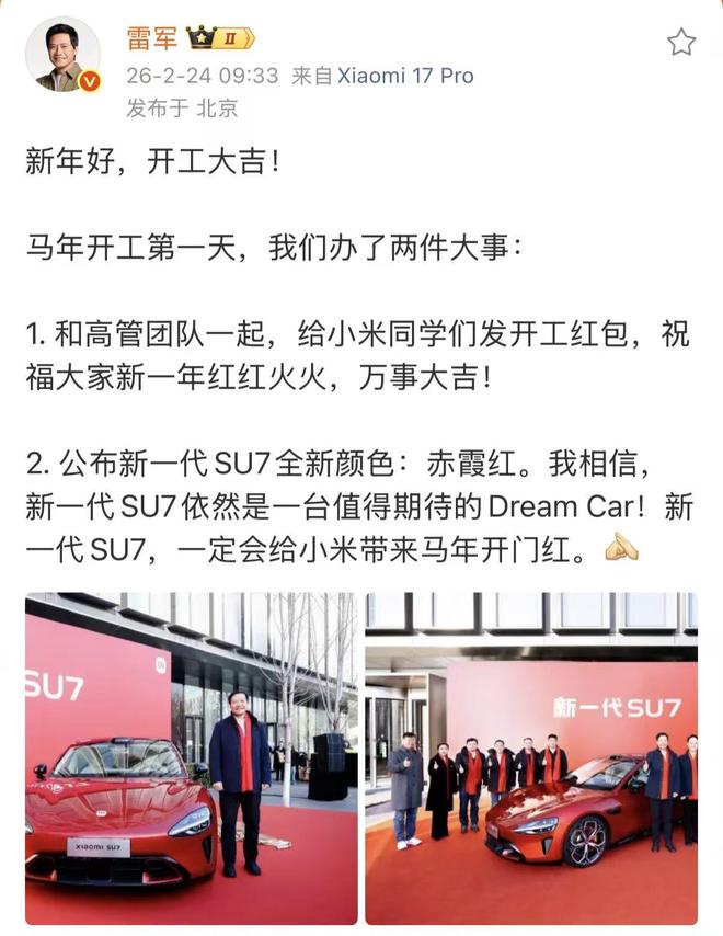 开工首日,雷军给员工发红包(多图) 访客 2026-02-24 15:56:05 68433 抢沙发 默认 2月24日,马年开工第一天,雷军和高管团队一起给员工发红包。现场十分热闹,雷军身边挤满员工,不少员工和雷军合影。雷军祝福大家新一年红红火火,万事大吉。此外,新一代SU7全新颜色“赤霞红”也正式亮相,是马年开门红的寓意。 标签: 马年 员工 海报 阅读 QQ 分享 微博分享 微信分享 分享 上一篇快手全员发开工红包:正式员工366元 下一篇蔚来春节累计换电超207万次,单站日服务近200次 快手全员发开工红包:正式员工366元上一篇 蔚来春节累计换电超207万次,单站日服务近200次下一篇 相关推荐 马年员工 西贝被曝降薪缓发、裁员赔偿分期1年,员工拒后被通知待岗 2026-03-04 快手全员发开工红包:正式员工366元 2026-02-24 百度发放开工红包:最高可得2026元 2026-02-24 小鹏2026年开工信:2026年将再增8000人 2026-02-24 Meta连续两年削减员工股权激励 2026-02-21 央媒看河南丨关注民俗展演等内容 2026-02-19 就是爱发钱,河南“爆金币”老板:把厚道做成经营根本 2026-02-14 酸了!河南一企业过年放假21天,老板:禁止加班、禁止打扰同事 2026-02-13 发表评论取消回复 快捷回复: 评论列表 (暂无评论,68433人围观)参与讨论 还没有评论,来说两句吧...