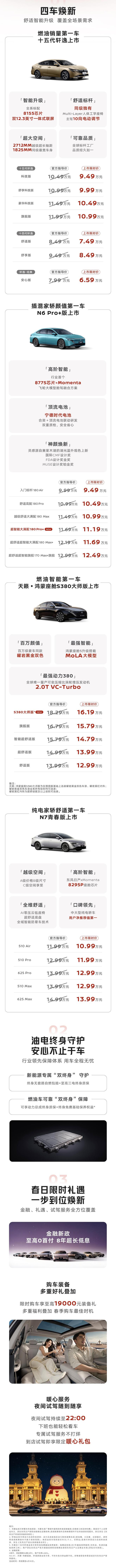 发布会上,东风日产针对燃油与新能源车型推出差异化“双终身”保障政策。其中,N6/N7可享终身无套路自燃包赔及三电终身质保权益;天籁全系及十五代轩逸可享终身免费保养服务;天籁全系可享整车终身质保,轩逸全系可享动力总成终身质保。同时,品牌还推出“至高0首付8年超长低息”金融方案、限时19000元装备礼以及夜间试驾随到随享等服务。