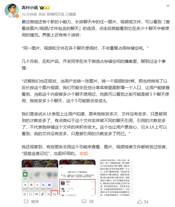 对此,微信员工"客村小蒋"作出回应,该功能的推出是为了让用户直观看到文件的使用情况,明确转发图片、视频或文件不会重复占用手机存储空间,从视觉层面缓解大家的存储焦虑。