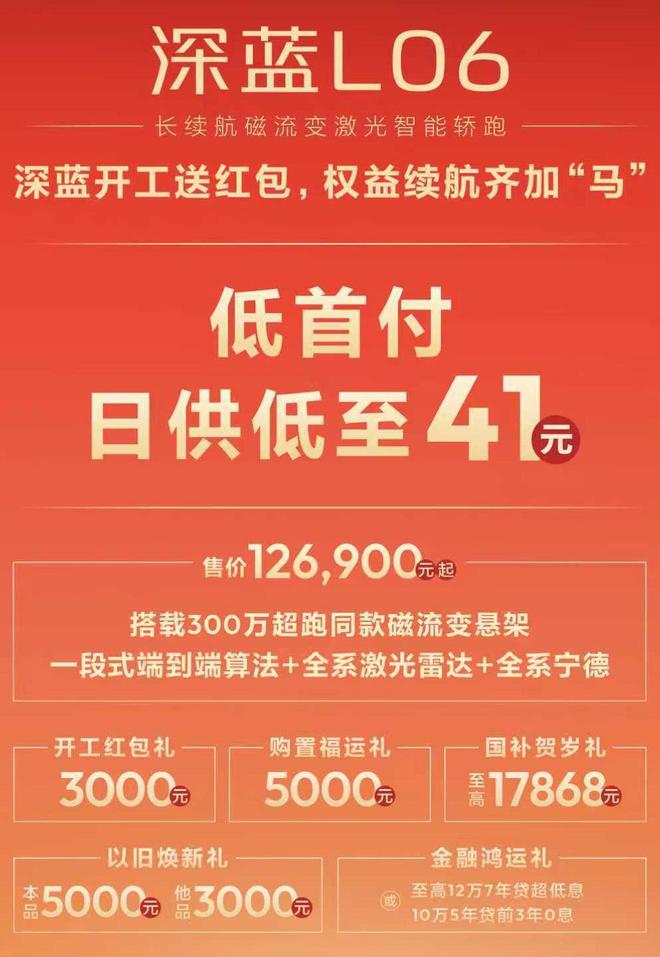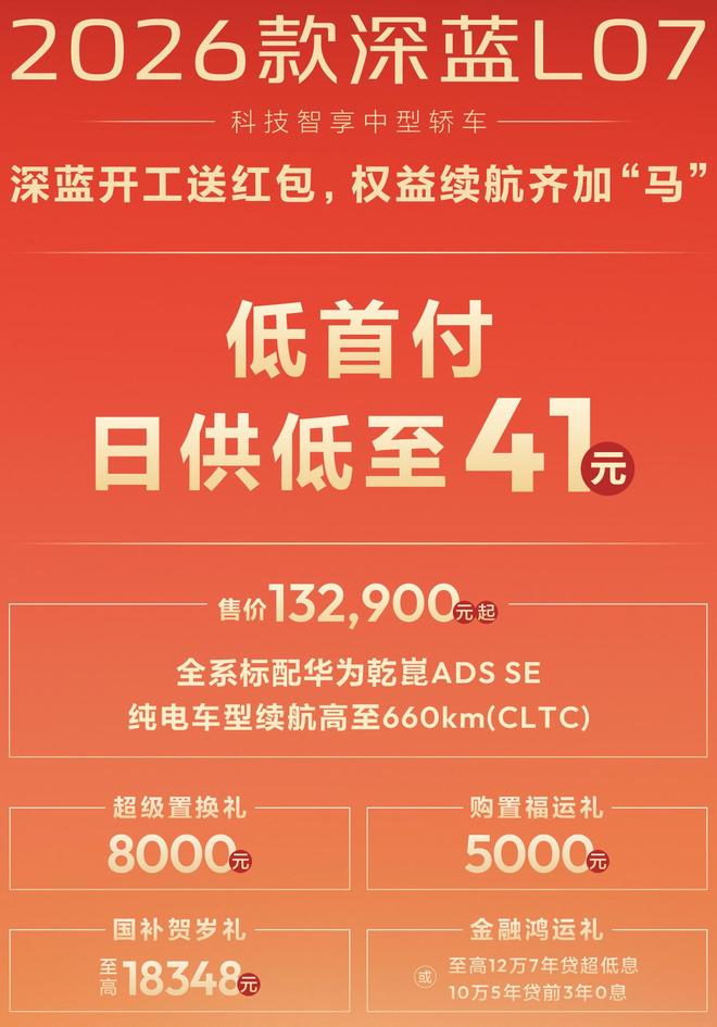 2月26日报道 日前,深蓝汽车针对旗下L06、G318无忧穿越版、S09、S07、S05、2026款L07车型推出了限时购车权益,包括至高5000元开工红包和至高10000元以旧换新礼等优惠政策,同时还推出至高20万7年贷超低息或20万5年贷0息等金融政策。