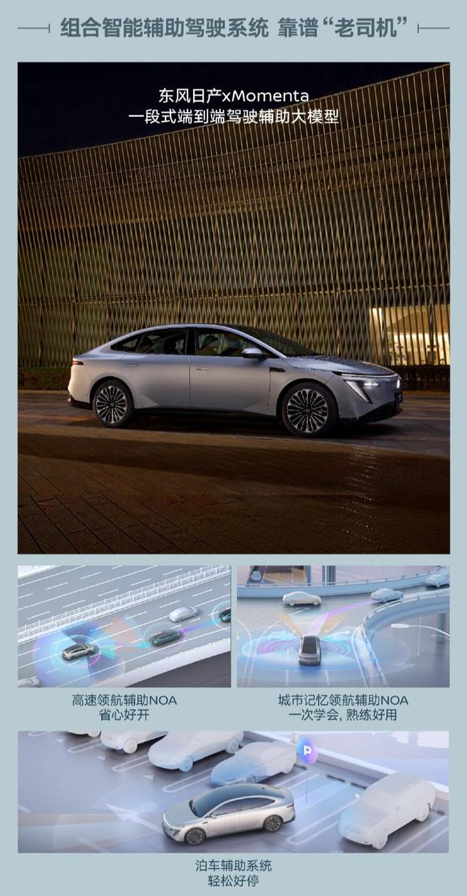 智能辅助驾驶方面,东风日产联合科技公司Momenta打造高阶智能辅助驾驶系统,深度定制一段式端到端辅助驾驶大模型,硬件上拥有22个高感知传感器、84Tops算力的Orin-N智驾芯片以及DMS驾驶员疲劳监测系统。