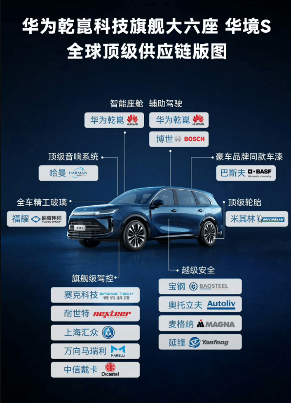 目前已知华境S首款车型的供应链版图,以供参考: