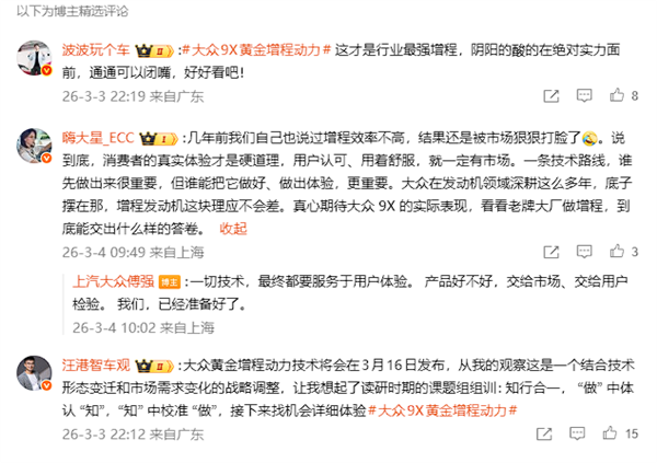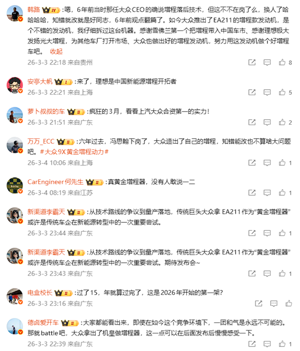 在评论区,不少汽车博主纷纷留言,有人称冯思翰已经下岗,大众造出了自己的增程,知错能改不是什么大问题;还有人盛赞大众EA211是真黄金增程器,没有人敢说一二;更有人帮腔称"这才是行业最强增程,阴阳的酸的在绝对实力面前,通通可以闭嘴,好好看吧!"