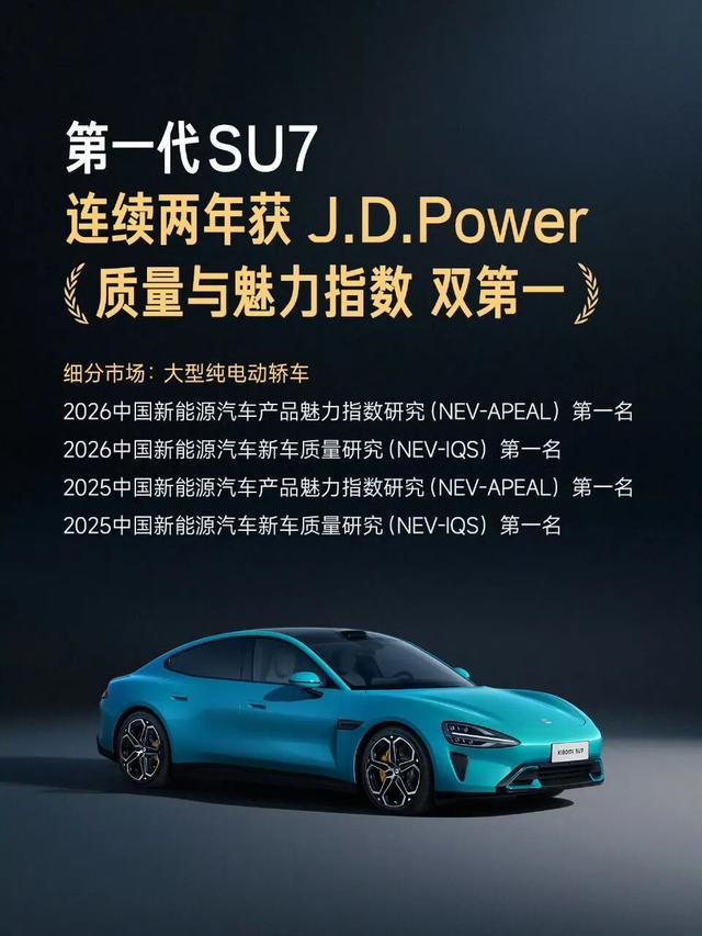 J.D. Power发布2026中国新能源汽车新车质量研究报告。小米汽车旗下第一代小米SU7以193个PP100的数值,夺得大型纯电动轿车品类第一名,并连续两年包揽该细分市场的质量与魅力双项冠军。