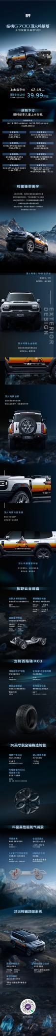4月1日报道近日,纵横品牌携手国内顶级硬派高端改装机构顶火,正式推出G700顶火鸣镝版,上市指导价42.49万元,限时权益价39.99万元,同步推出九重上市专属购车权益。涵盖限时订车礼、金融方案、置换补贴及专属质保政策等多重福利。