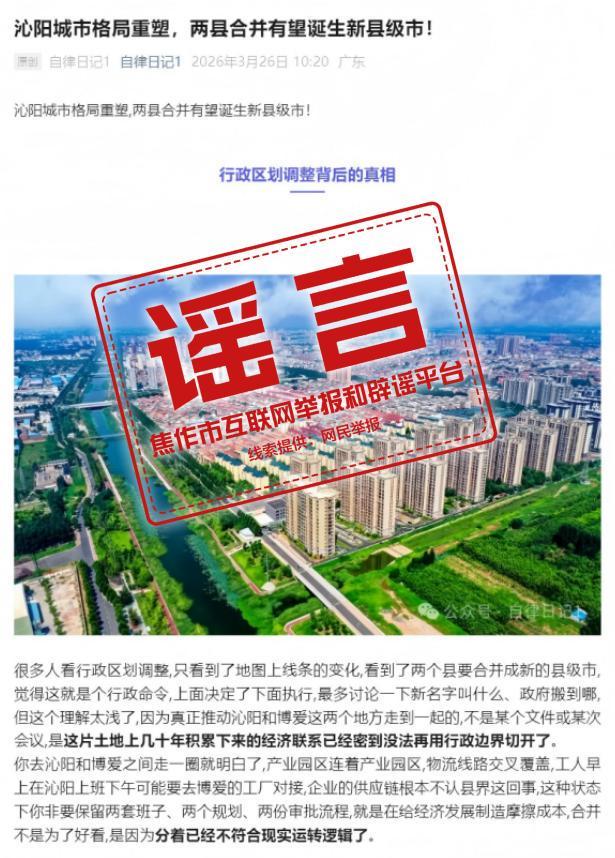 3月26日,微信公众号“自律日记1”发布标题为“沁阳城市格局重塑,两县合并有望诞生新县级市”的文章,称“焦作市的沁阳和博爱要合并成新的县级市”,引发网民关注。经焦作市委网信办、市民政局联合调查,网传信息毫无事实依据,系账号主办者为博取关注、吸引流量而编造的虚假信息。目前,焦作市网信办已责令账号主办者删除相关信息,并对其进行批评教育。