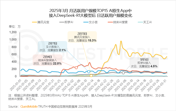 不少产品增长与接入DeepSeek密切相关,纳米AI搜索接入次日活跃用户激增22.0%,腾讯元宝日活亦提升15.3%。
