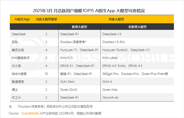 TOP15的应用中超七成已支持"1个对话模型+1个推理模型"双驱动架构。腾讯元宝、文小言等应用甚至整合4个以上大模型,纳米AI搜索更以支持15种模型居首。