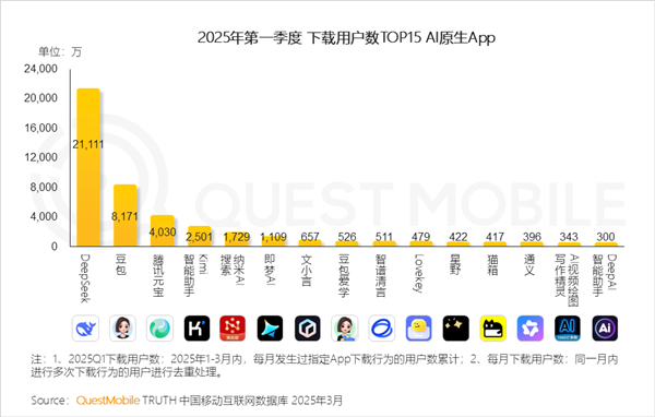 下载量方面,2025年一季度DeepSeek下载用户数2.11亿,豆包下载用户数8171万,腾讯元宝下载用户数4030万。