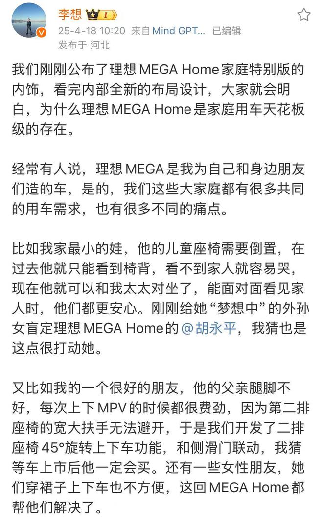 今日理想汽车CEO李想发文再谈理想MEGA,“经常有人说,理想MEGA是我为自己和身边朋友们造的车,是的,我们这些大家庭都有很多共同的用车需求,也有很多不同的痛点。”