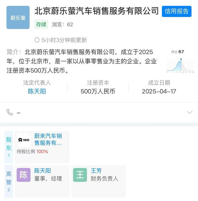 经营范围含新能源汽车整车销售、新能源汽车电附件销售、新能源汽车换电设施销售、电动汽车充电基础设施运营、充电桩销售、机动车充电销售、电池销售等。股东信息显示,该公司由蔚来汽车销售服务有限公司全资持股。
