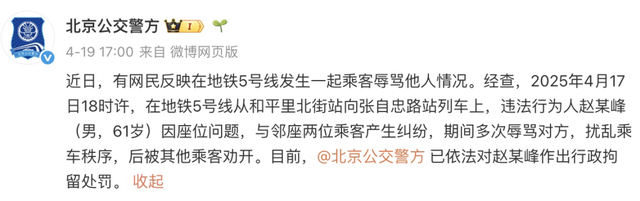 据北京公交警方4月19日通报,违法行为人赵某峰(男,61岁)因座位问题,与临座两名乘客产生纠纷,期间多次辱骂乘客,扰乱乘车秩序,后被其他乘客劝开,已依法对赵某峰行政拘留。