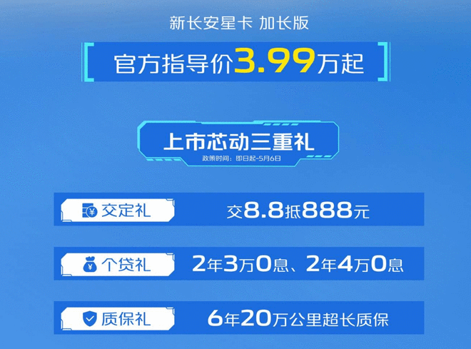 4月20日报道 近日,新长安星卡加长版正式上市,售价3.99万元起。随着新车的上市,新长安星卡加长版限时推出上市芯动三重礼。