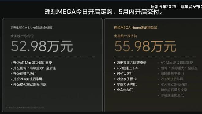 理想MEGA Home家庭特别版全国统一零售价55.98万元。今日开启定购,5月内开启交付。(三言科技)