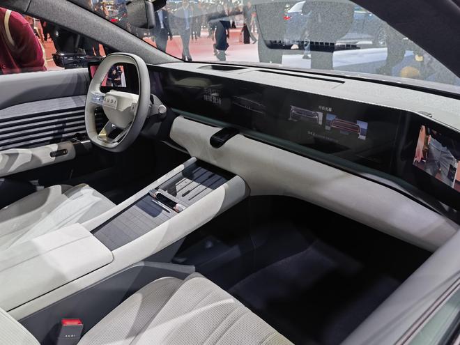内饰方面,E5 Sportback量产版取消了传统物理按键,采用贯穿式一体大屏设计,集成了所有功能,包括导航、娱乐和车辆控制等。采用上深下浅的双色搭配,给人以宽敞明亮之感。中控台摒弃了传统的物理按键,一体式贯穿大屏集成了日常操作的所有功能,涵盖流媒体外后视镜显示屏、液晶仪表盘、中控屏和副驾屏,为车内带来了强烈的未来感。此外,车内还配备了由AI驱动的虚拟助手,支持语音交互和触控操作,提升了智能化体验。中控台区域设计简洁,储物空间充足,中央通道下方采用镂空设计,进一步提升了实用性。