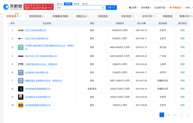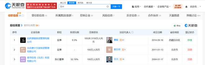 美团王兴名下关联30余家企业 访客 2025-04-24 15:51:50 74173 抢沙发 默认 据天眼查App显示,王兴名下有30余家企业,其中大多数为存续状态,包括北京三有限公司、北京三快云计算有限公司、宁波梅山保税港区艾克思求解投资合伙企业(有限合伙)等,版图涉及科技、云计算、投资管理、企业管理等。 标签: 北京 天眼 海报 阅读 QQ 分享 微博分享 微信分享 分享 上一篇周鸿祎回应被“卤鹅哥”投喂:没觉得被冒犯,自己做安全工作,不太可能吃陌生人递来的食物 下一篇上海车展上演全武行?警方:造谣者被依法行政处罚 周鸿祎回应被“卤鹅哥”投喂:没觉得被冒犯,自己做安全工作,不太可能吃陌生人递来的食物上一篇 上海车展上演全武行?警方:造谣者被依法行政处罚下一篇 相关推荐 北京天眼 罗马仕遭罚没124万罚款 2025-12-14 李亚鹏持股公司恢复执行金额达4.5亿 2025-12-14 护理流感儿童指南,避免误区,掌握用药与退烧要点一图解析 2025-12-14 流感防护误区解析,身体并非万能防护盾,避免错误应对症状 2025-11-30 雷军揭秘小米工厂未来五年新变化,北京产业基础底气助力发展 2025-11-28 岳云鹏夫妇公司欠税被曝光,涉及金额达十四万 2025-11-26 2025年北京搬家公司推荐,实力领跑五强搬家公司名单揭晓 2025-11-21 北京地铁新进展揭秘,河北区域直达北京仅需9分钟! 2025-11-20 发表评论取消回复 快捷回复: 评论列表 (暂无评论,74173人围观)参与讨论 还没有评论,来说两句吧...