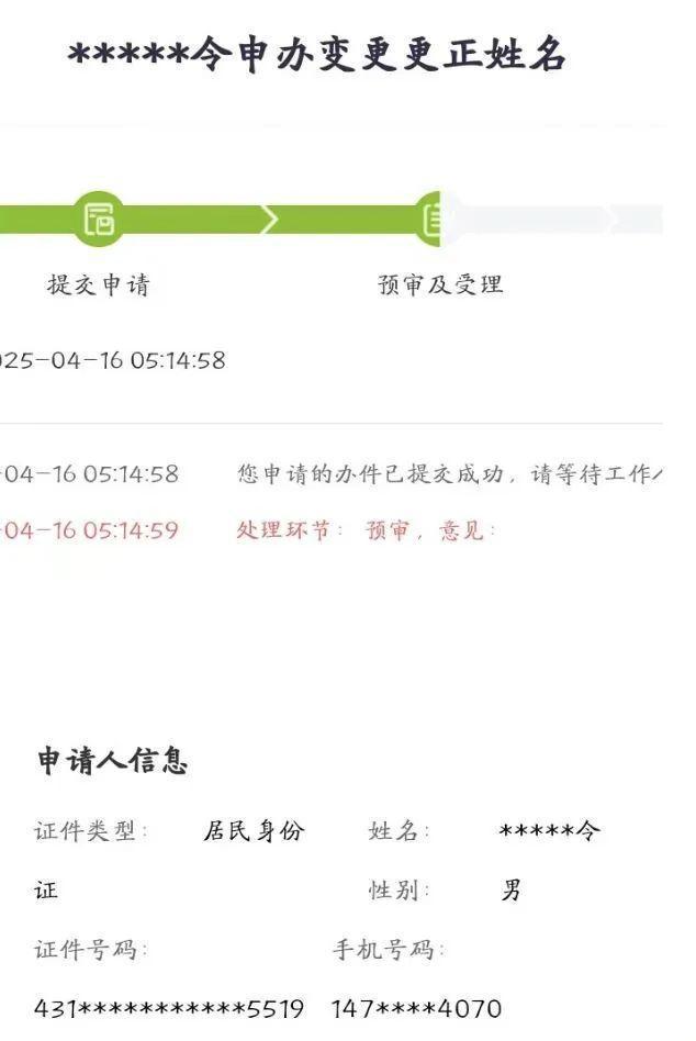 小朱于4月16日提交了第三次改名申请,显示正处于预审状态