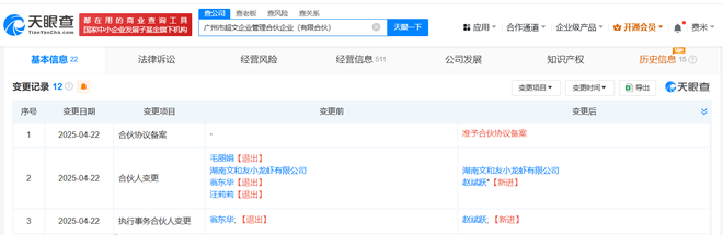 天眼查App显示,近日,广州市超文企业管理合伙企业(有限合伙)发生工商变更,翁东华卸任该合伙企业执行事务合伙人并退出合伙人行列,赵斌跃接任执行事务合伙人,此外原合伙人汪莉莉、毛丽娟退出,新增赵斌跃为合伙人。