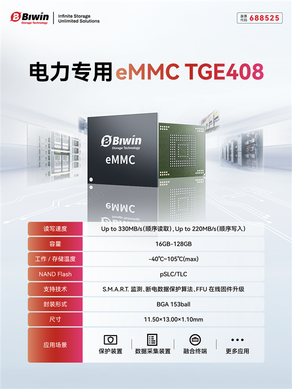 佰维存储推出了100%国产化电力专供eMMC,该产品搭载佰维自研主控与国产NAND,从芯片设计到流片制造全程本土化,自主可控满足电力行业对数据安全的关键诉求。