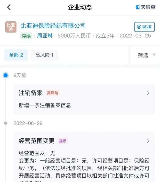 天眼查显示,比亚迪保险经纪有限公司近日发布注销备案,拟决议解散,该公告的公示期为2025年4月17日至2025年6月1日。
