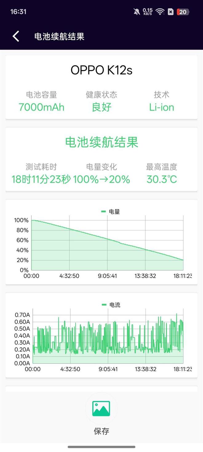 经过电池狗狗续航测试,OPPO K12s的电量从100%消耗至20%耗时18小时11分钟23秒,经过折算,综合续航时长超过了22.5个小时,这一续航能力在我们电池狗狗续航榜单中位列第二,这一成绩相较同类产品平均续航水平领先了2小时以上,并且强势登陆电池狗狗续航榜单次席。