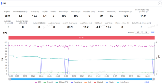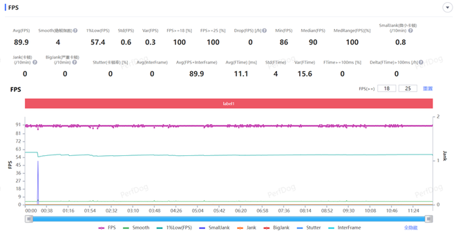 经过一场激烈的5V5团战测试后,游戏的平均帧率稳定在89.9FPS,几乎全程满帧运行,毫无压力,轻松应对这款国民级手游的高帧率需求。