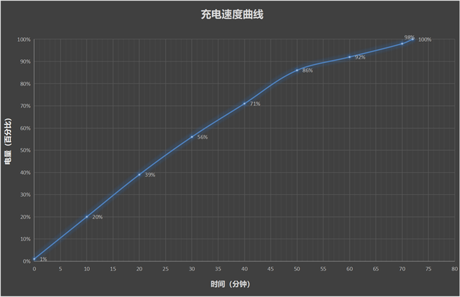10分钟电量充至20%,20分钟充电至39%,半小时电量达到56%,一小时电量来到了92%,此时已经进入到了涓流充电阶段,最终完全充满用时72分钟。